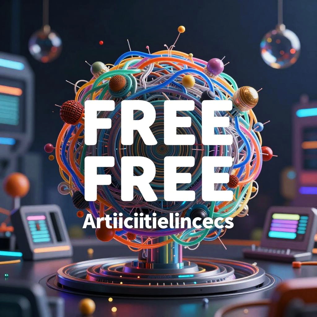 Digital artwork featuring a vibrant, colorful, 3D sphere composed of intertwined neon wires and spheres in red, blue, orange, yellow, and green, set against a dark, futuristic background with glowing, abstract control panels. The sphere is centered, with bold white text "FREE" overlaid in the middle, and smaller text "Artistics" below. The background includes suspended metallic spheres and a subtle, neon-lit ambiance. The image has a high-tech, sci-fi aesthetic with a glossy, reflective texture.
