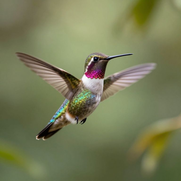 Photograph of a vibrant hummingbird mid-flight, wings blurred, iridescent green feathers, pink throat, white underbelly, against a soft