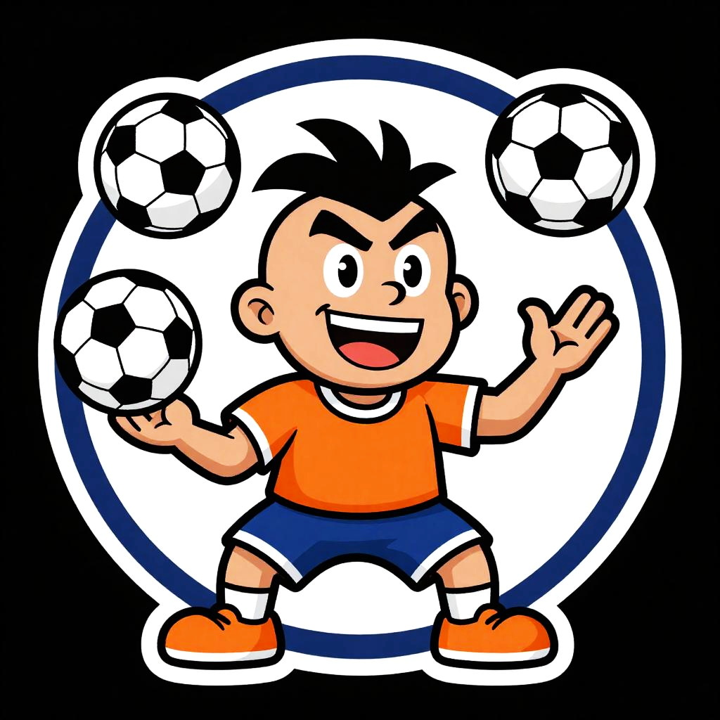 Funny sports logo showcasing a quirky team emblem with a silly mascot juggling multiple sports balls, stylized in a colorful, caricatured design with sharp outlines and a fun, energetic vibe, designed to appeal to kids and sports fans alike.