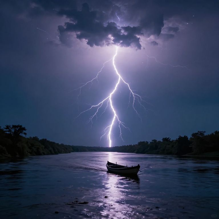 Photograph of a dramatic nighttime scene featuring a bright, jagged lightning bolt illuminating a calm river. A small, dark wooden rowboat floats in the reflective water, centered in the foreground. The sky is filled with dense, dark clouds, with the lightning casting a vibrant blue and white glow. Silhouetted trees line the riverbanks, creating a natural frame. The overall color palette includes deep blues and purples, highlighting the contrast between the dark water and the bright lightning. The image exudes a sense of power and tranquility.
