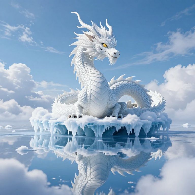 Digital art of a majestic white dragon with sharp scales and yellow eyes, sitting on a floating ice island, reflecting in a calm, blue sky with fluffy