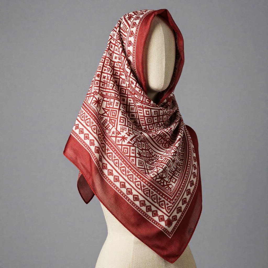 Ghutra headscarf styled on a mannequin, minimalist studio background, sharp focus on fabric pattern and weave, red and white geometric designs, smooth cloth draping, modern fashion editorial aesthetic, subtle lighting and elegant composition