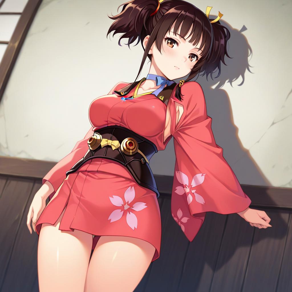 Mumei (kabaneri), koutetsujou no kabaneri, 1girl, red eyes, brown eyes, short hair, brown hair, black hair, twintails, hair ribbon, medium breasts, short kimono, ribbon choker, long sleeves, by artist h2so4, illustrious