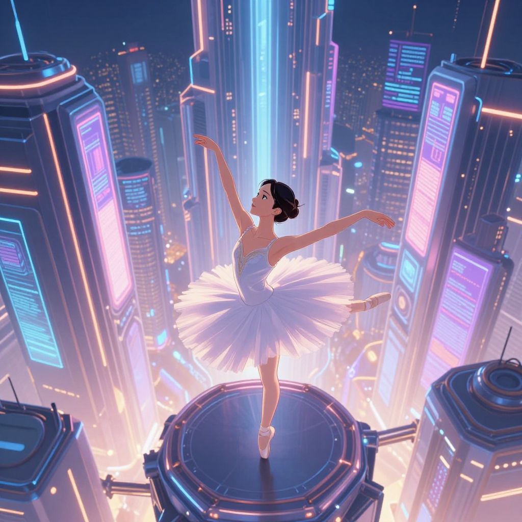 Digital art: Ballerina in white tutu, poised on futuristic circular platform, surrounded by neon-lit skyscrapers in a cyberpunk city
