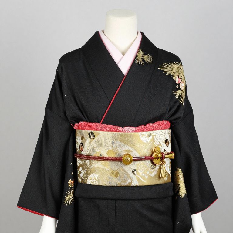 Mannequin wearing a black and gold kimono with a red belt.