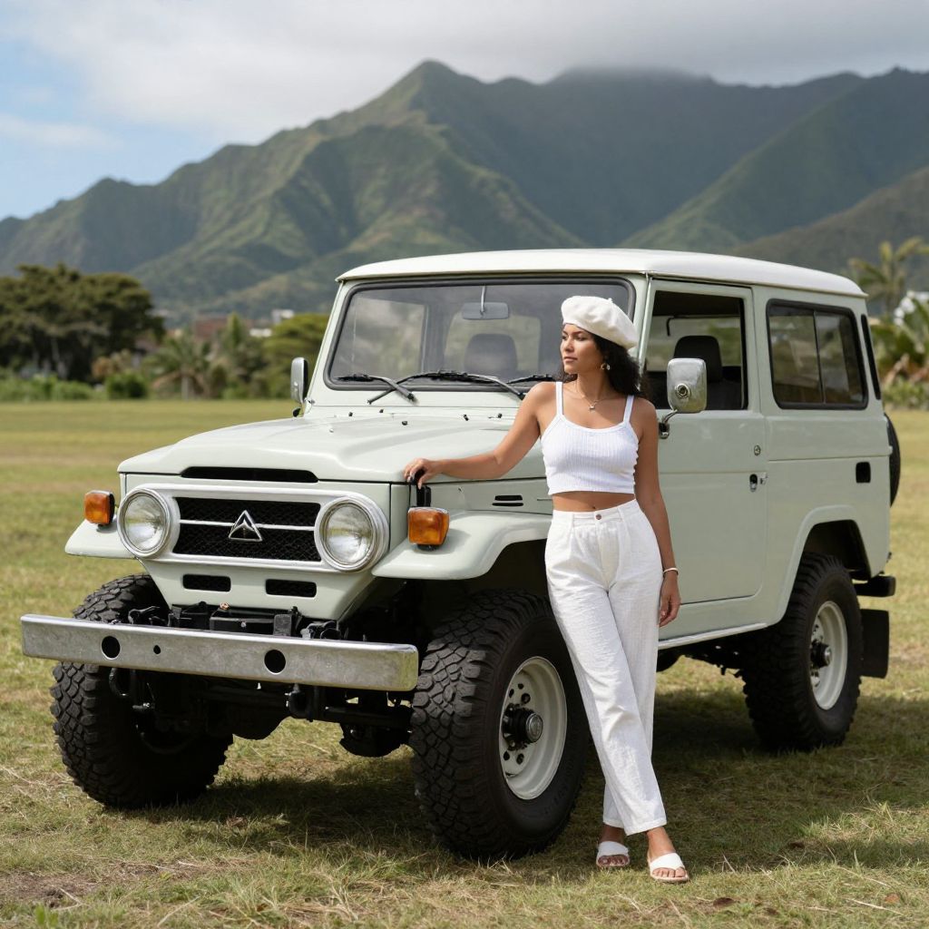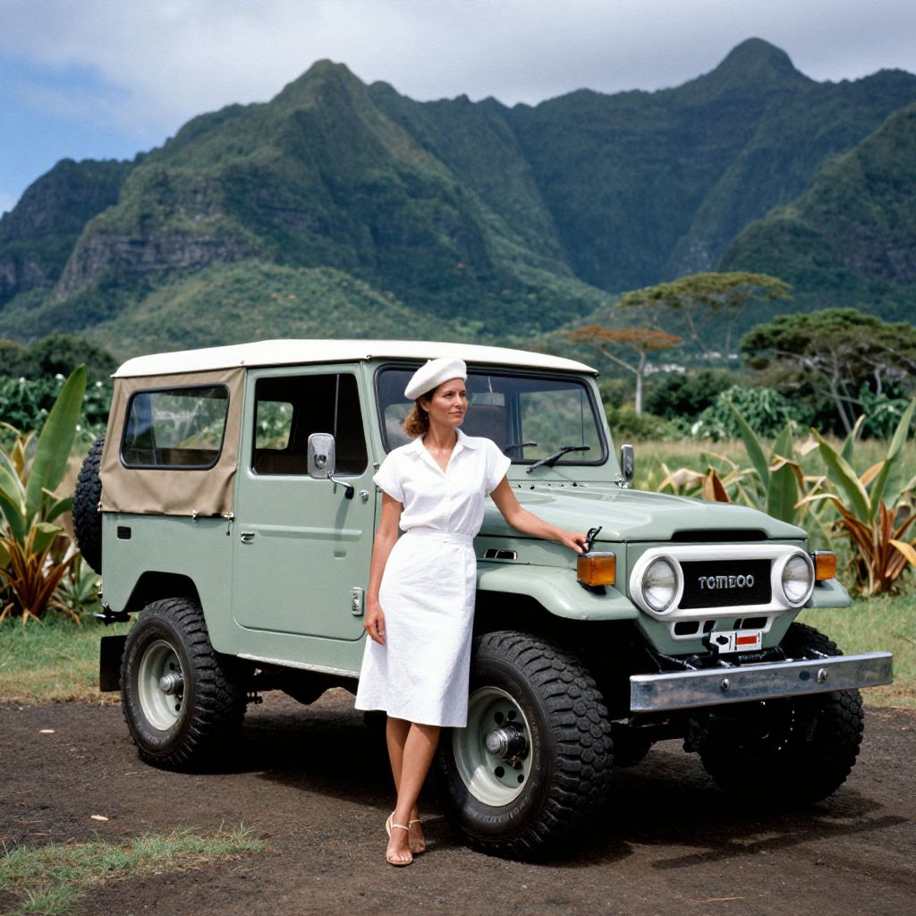 A woman stands by a vintage Toyota Landcruiser FJ40 in a tropical setting with mountains in the background, wearing a white outfit and a beret, on a sunny day in Tahiti.