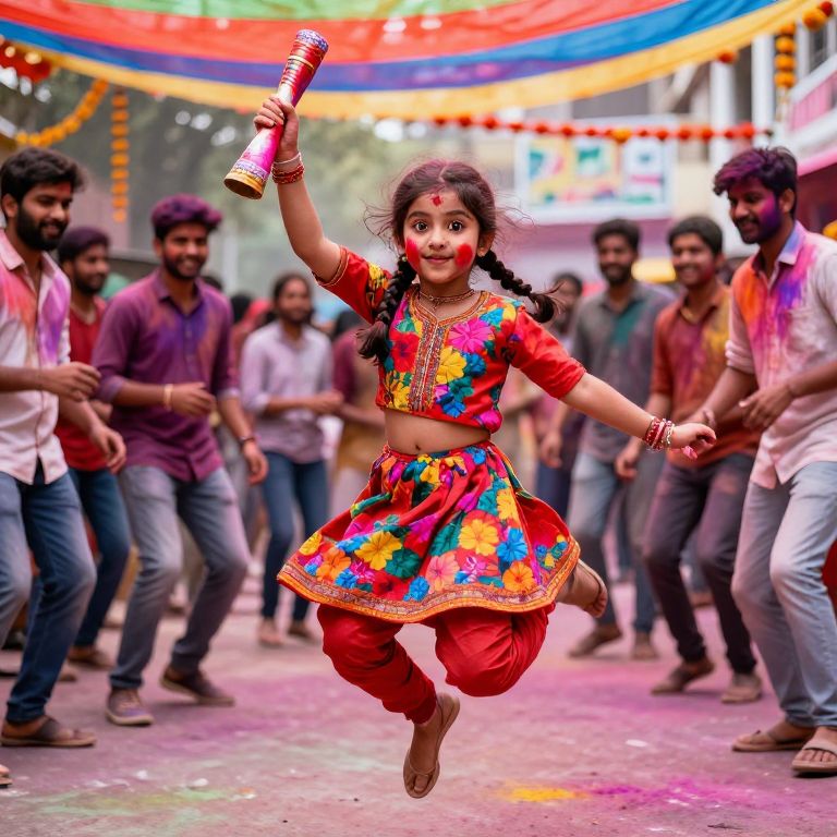 A lively group photo at a Holi festival in Varanasi, showing a young girl with fair skin, big round eyes, and braided brown hair wearing a bold Holi outfit with colorful floral prints, holding a traditional cone of colored powders as she jumps in a group with friends under a canopy of holi banners