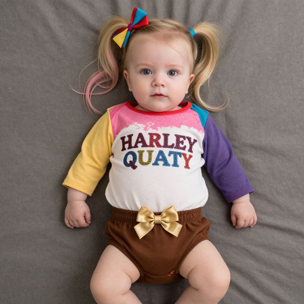 Photograph of a light-skinned baby with blonde hair in pigtails, each tied with colorful ribbons (red, blue, yellow). The baby wears a white, long-sleeve shirt with "Harley Quilty" in bold, multi-colored letters, yellow sleeves, and a pink trim. Brown shorts with a gold bow at the waist. The baby lies on a gray fabric background, arms and legs slightly spread. The baby's blue eyes are wide open, and expression is neutral. The texture of the fabric background is soft and slightly wrinkled. The image has a bright, colorful, and playful aesthetic.