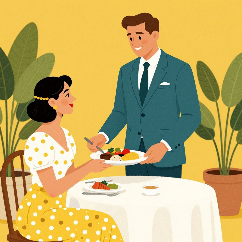 Elegant retro-style illustration depicts a man in a teal suit serving food to a woman in a polka-dotted dress, both smiling warmly at a table adorned with a plate of food, utensils, and a small bowl, set against a vibrant yellow background with green foliage and a potted plant.