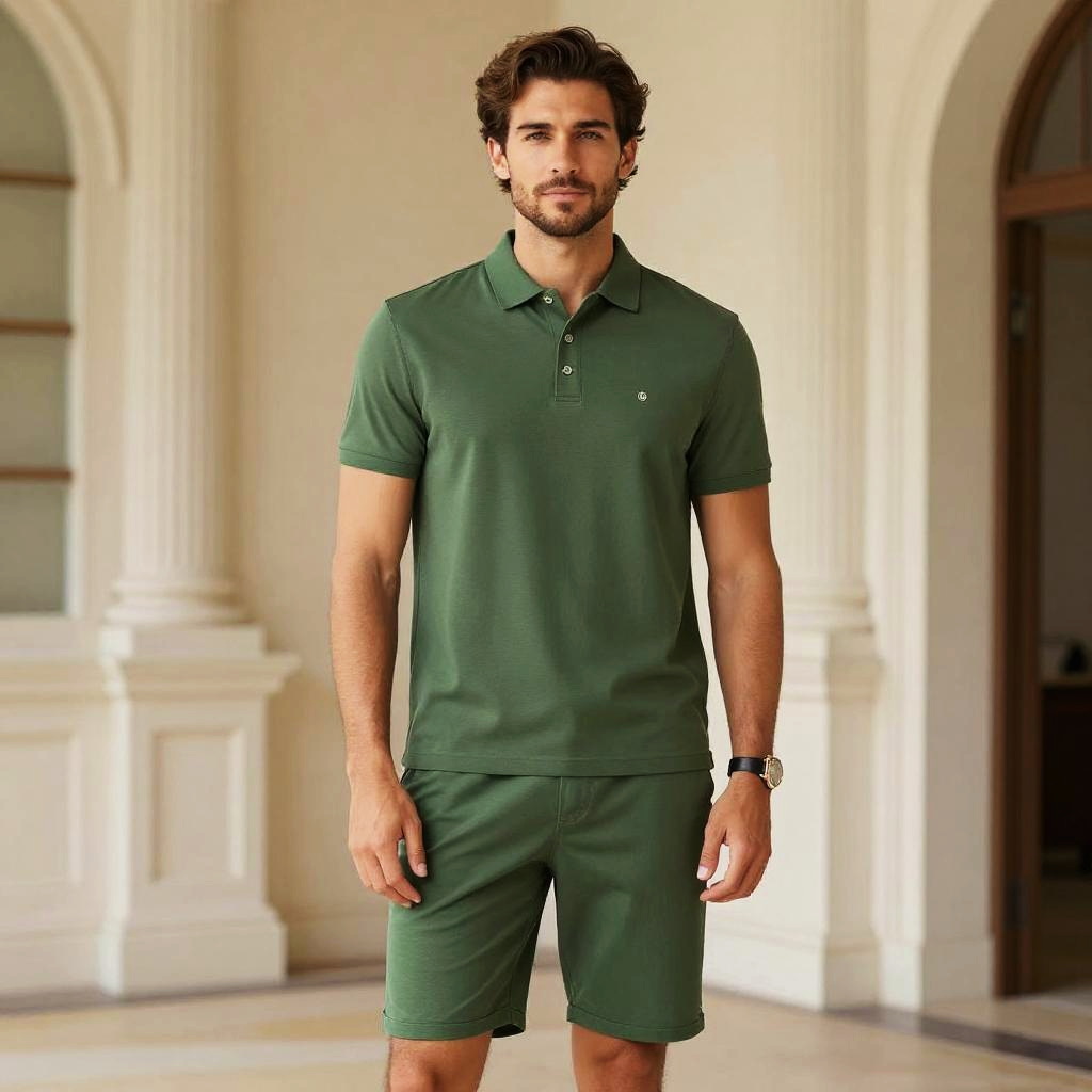 A confident man poses in a stylish green polo shirt and matching shorts, creating an artistic and fashionable look in an elegant interior with classical architecture.