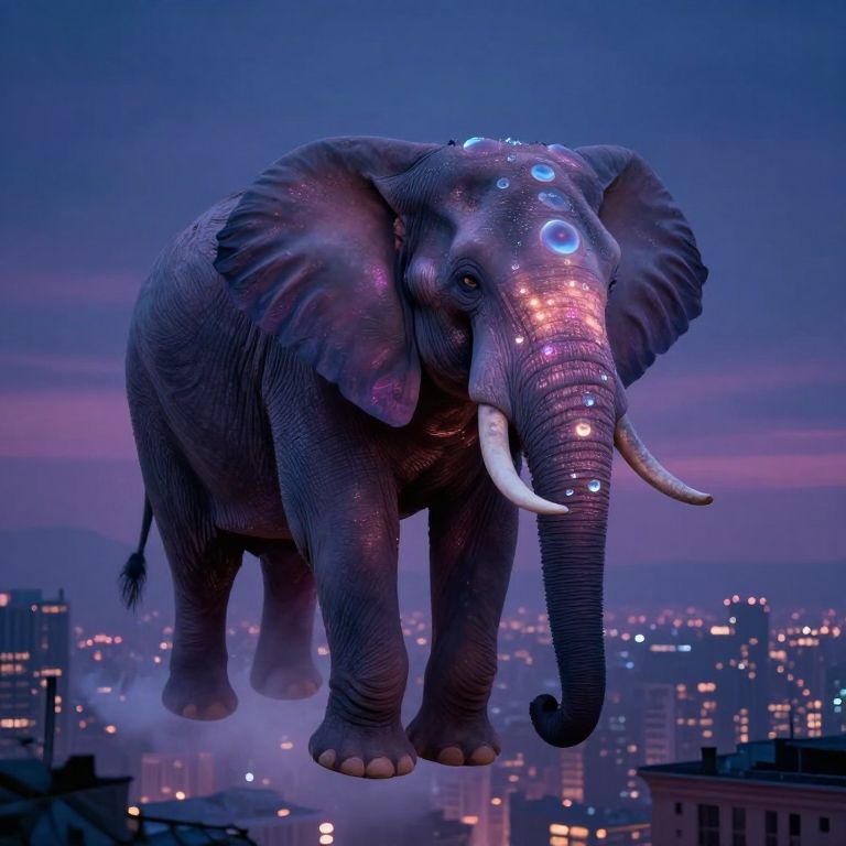 Digital artwork of a glowing, illuminated elephant with blue and pink lights, flying over a cityscape at dusk, with skyscrapers in the background.