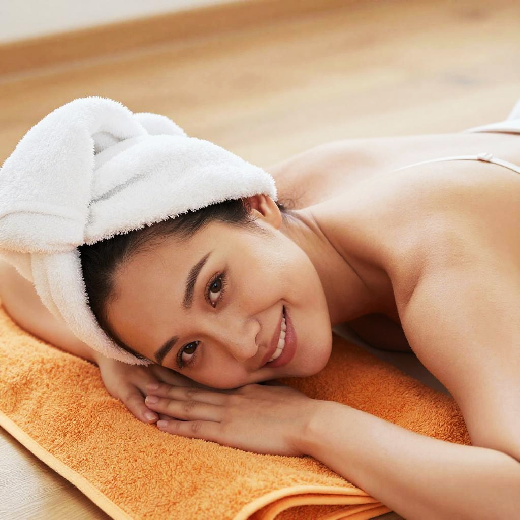 Photograph of a smiling, bare-shouldered Asian woman with a white towel on her head, lying on an orange towel on wooden floor.