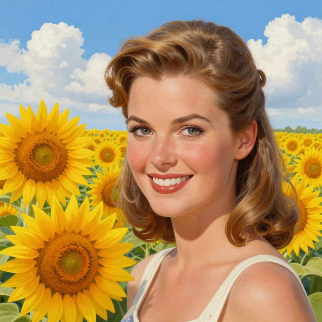 A vibrant digital painting reminiscent of Grant Wood's style, featuring a woman with polished hair and a warm smile, set against a sunlit field of sunflowers under a clear blue sky with fluffy clouds, rendered in vivid colors and realistic detail.