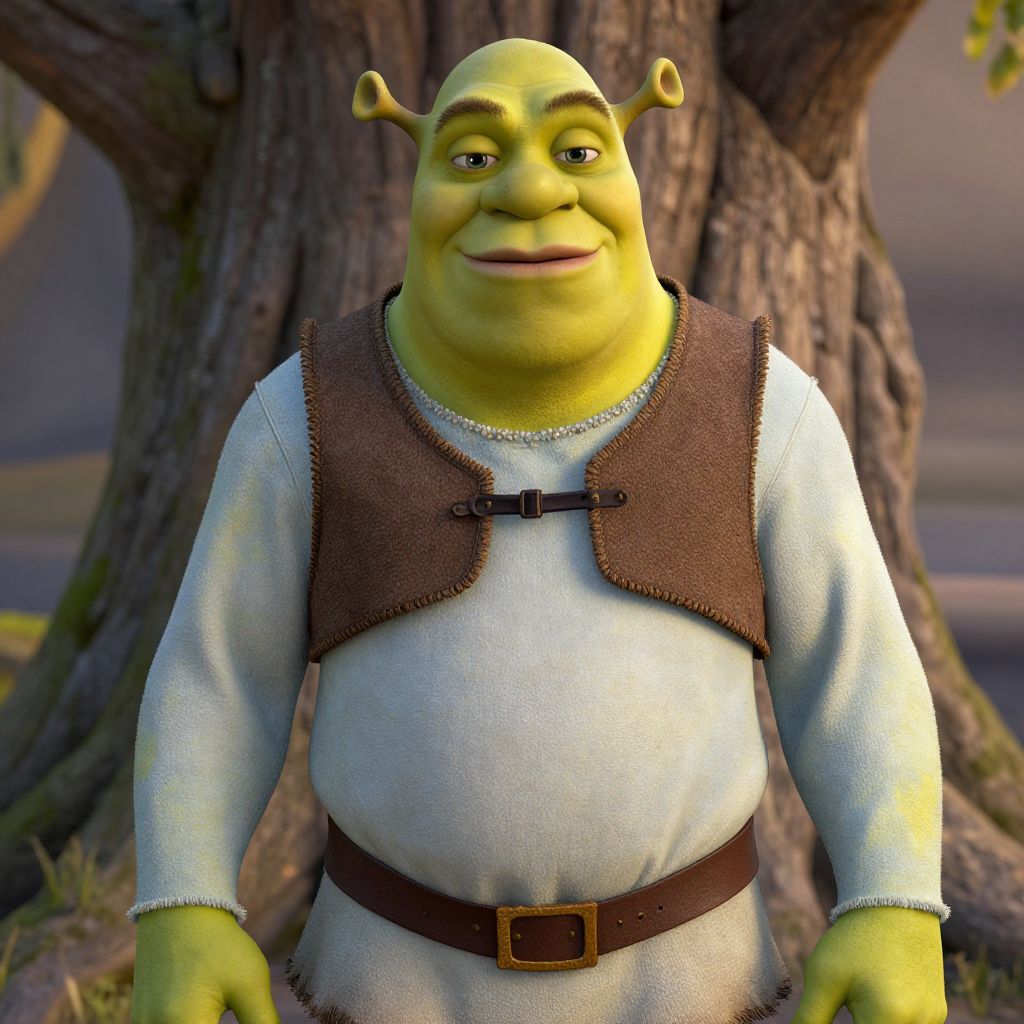 Shrek Brown Vest, man in a brown vest and blue shirt standing in front of a tree