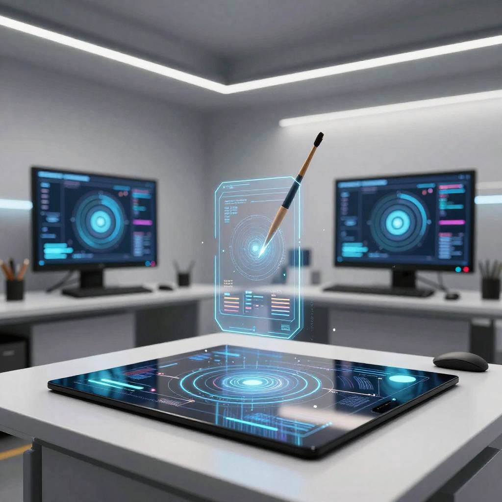 A.i. generated images illustrating a futuristic artist's studio filled with holographic canvases and floating digital brushes, sleek minimalist design, cool color palette, photorealistic texture, emphasizing the fusion of human creativity and artificial intelligence.