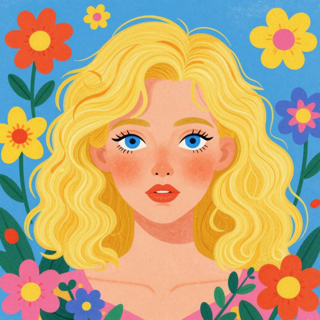 Digital illustration of a young Caucasian woman with vibrant blue eyes and wavy, shoulder-length blonde hair. She has rosy cheeks, full red lips, and is wearing a pink shirt adorned with colorful floral patterns. The background is a bright blue sky filled with various colorful flowers, including yellow, pink, red, and purple blooms with green leaves. The style is reminiscent of 1960s pop art, featuring bold colors, clean lines, and a cheerful, whimsical aesthetic. The woman's expression is neutral, and her hair has a few small red hairpins.