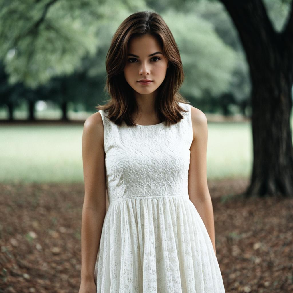 Fairy floral dress,1girl, solo, dress, flower, brown hair, long hair, floral print, outdoors, white dress, blurry, sleeveless, standing, sleeveless dress, looking at viewer