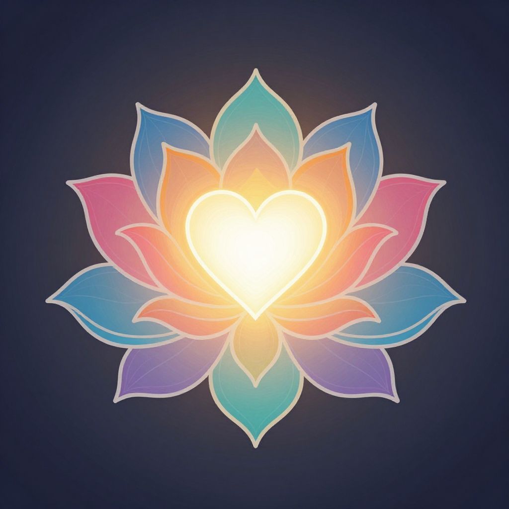 Symbol for self love, a stylized lotus flower combined with a glowing heart at the center, vibrant colors, elegant line art, mystical and serene atmosphere
