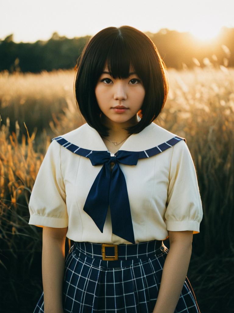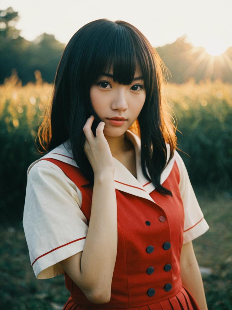 Sexy cosplay woman character wearing Kanako Kasugazaki costume. Realistic photo. Jane Doe dressed as Kanako Kasugazaki --sref 1390