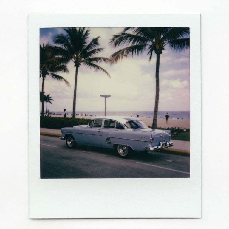 A vintage Polaroid photograph of Miami Beach, featuring a classic car, palm trees, and a serene beach scene with diffused lighting and muted colors.