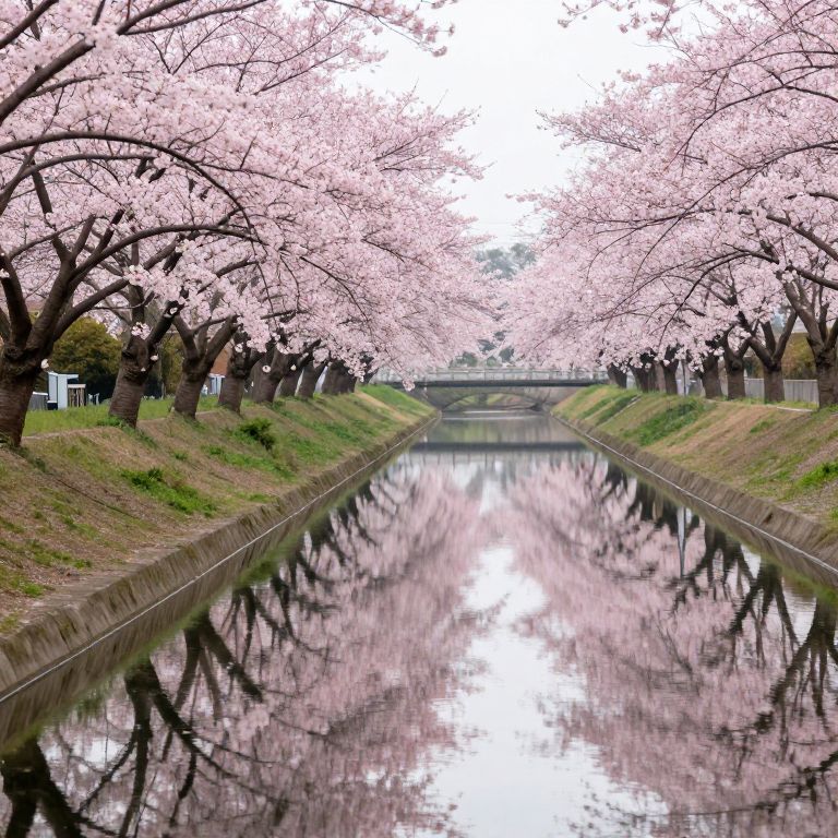 Photograph of a serene canal lined with cherry blossom trees, their pink flowers reflected perfectly in the calm water, creating a symmetrical, picturesque scene.