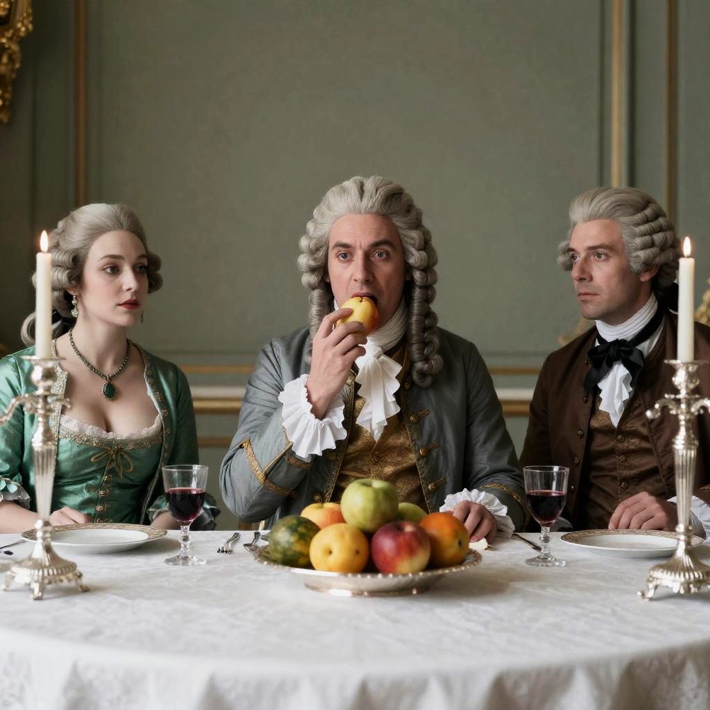 Photograph of three 18th-century aristocrats at a lavish table. Central figure with exaggerated wig, wearing ornate dress, eating fruit. Left figure, pale skin, large breasts, green dress, necklace. Right figure, blond wig, brown coat, black ribbon. White lace tablecloth, silver candelabras, fruit, wine glasses. Intense expressions on faces.