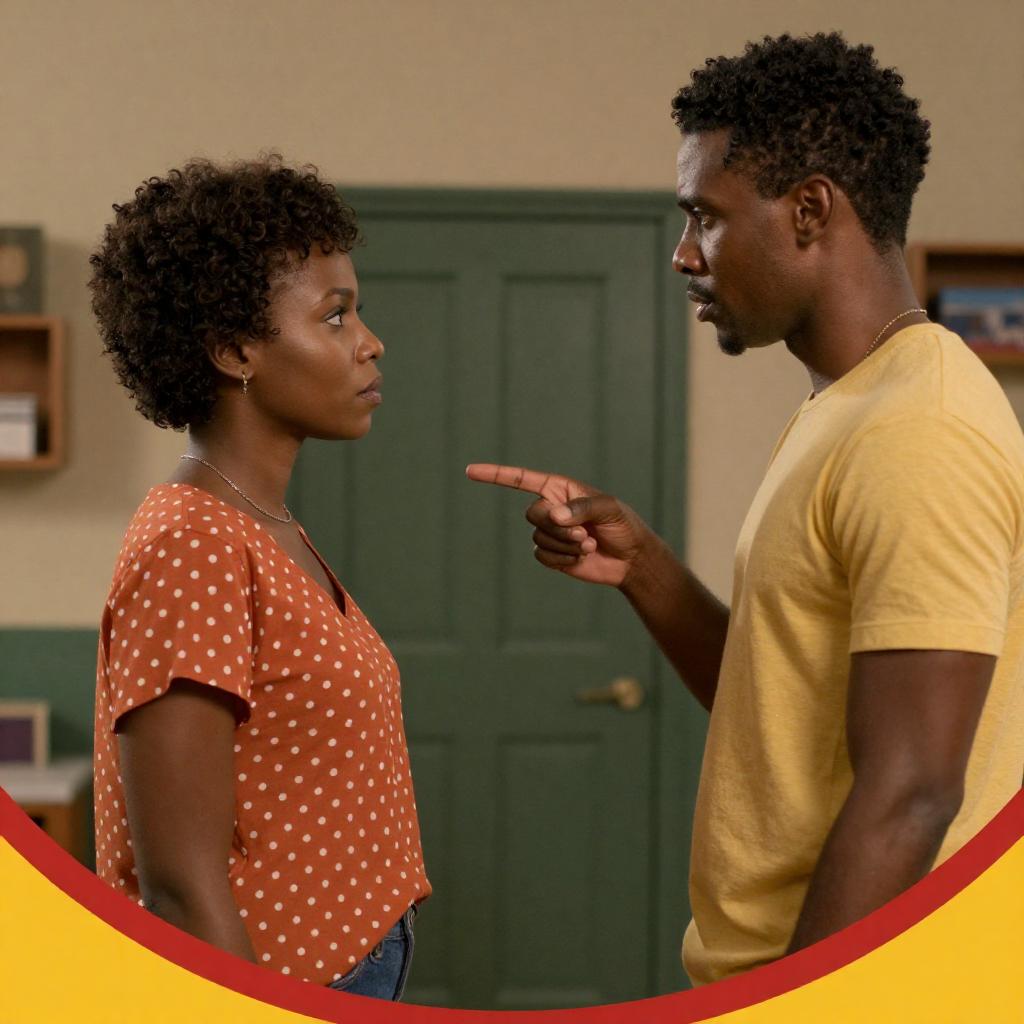 Photograph of a muscular Black man in a white tank top and gray shorts standing in a green kitchen, facing a curvy Black woman with long black hair, wearing a denim jacket and floral dress, gesturing with her hands in a dimly lit room with wooden doors and cabinets.
