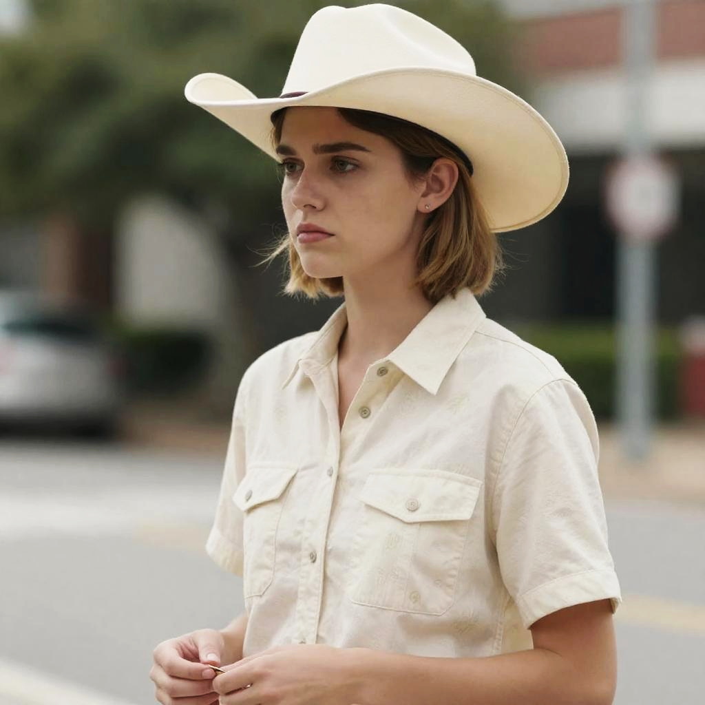 Photograph of a young white woman with light skin, wearing a beige cowboy hat and a short-sleeved, cream-colored, patterned shirt with pockets. She has short, light brown hair, slightly parted to the side, and is looking to the side with a slight frown. She is holding a small object in her right hand. Background includes a blurred street and greenery. She is positioned slightly to the right, facing left.