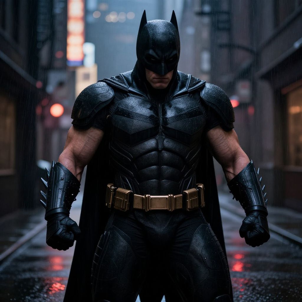 Photorealistic digital art of muscular Batman standing in a rainy, neon-lit city alley, wearing dark armored suit, cape, gloves, and gold