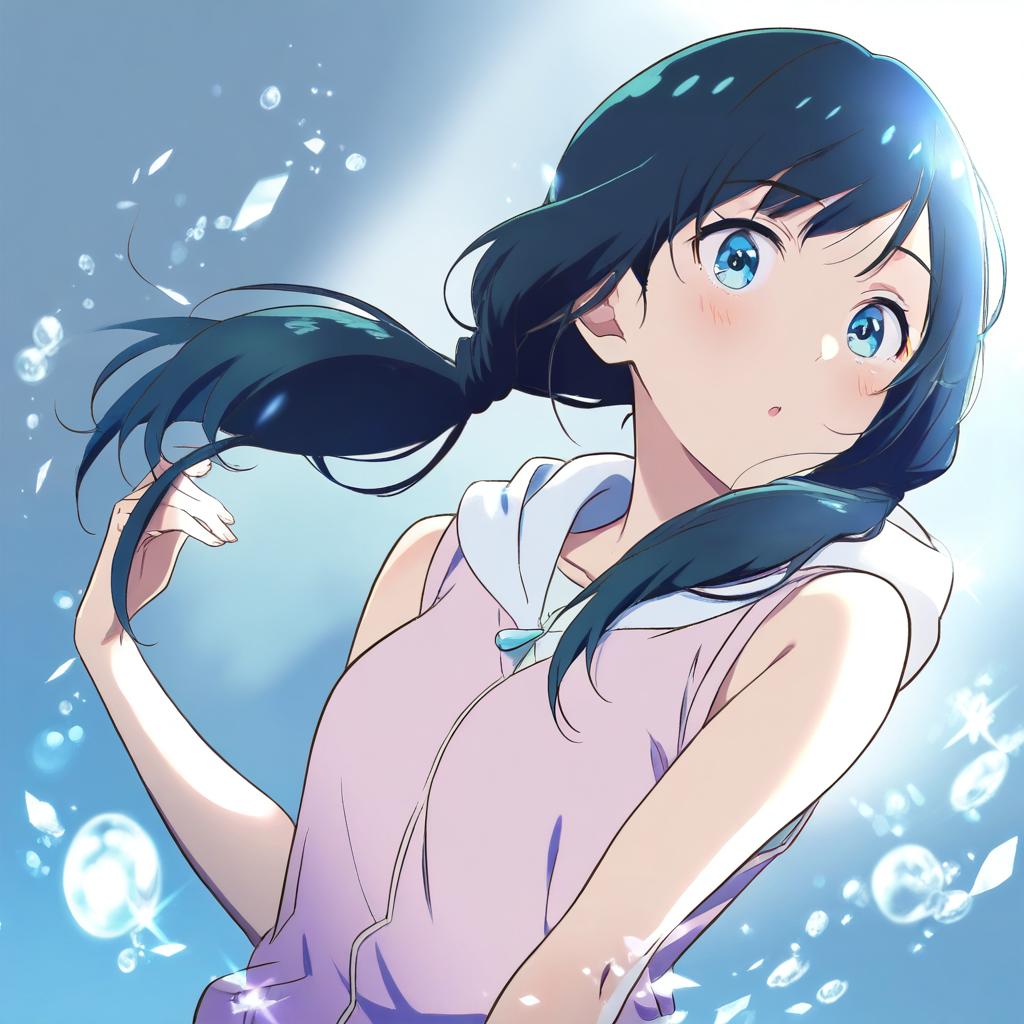 Amano hina (tenki no ko), tenki no ko, 1girl, blue eyes, long hair, black hair, low twintails, sleeveless jacket, hood down, bare arms, by artist unagi (kobucha blaster), animagine