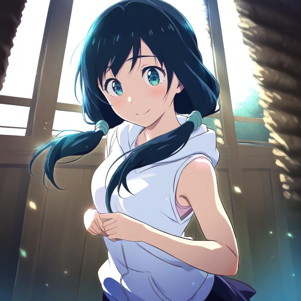 Digital anime-style illustration of a young girl with long black low twintails and striking blue eyes. She is wearing a sleeveless white jacket with the hood down, exposing her bare arms, set against a softly lit background with window panes and draped curtains. The artwork features bright and gentle lighting effects, enhancing the serene and friendly expression on the girl's face.