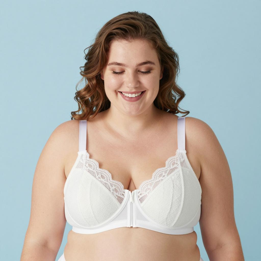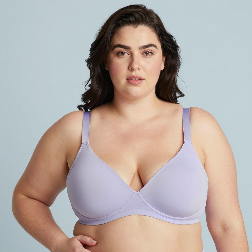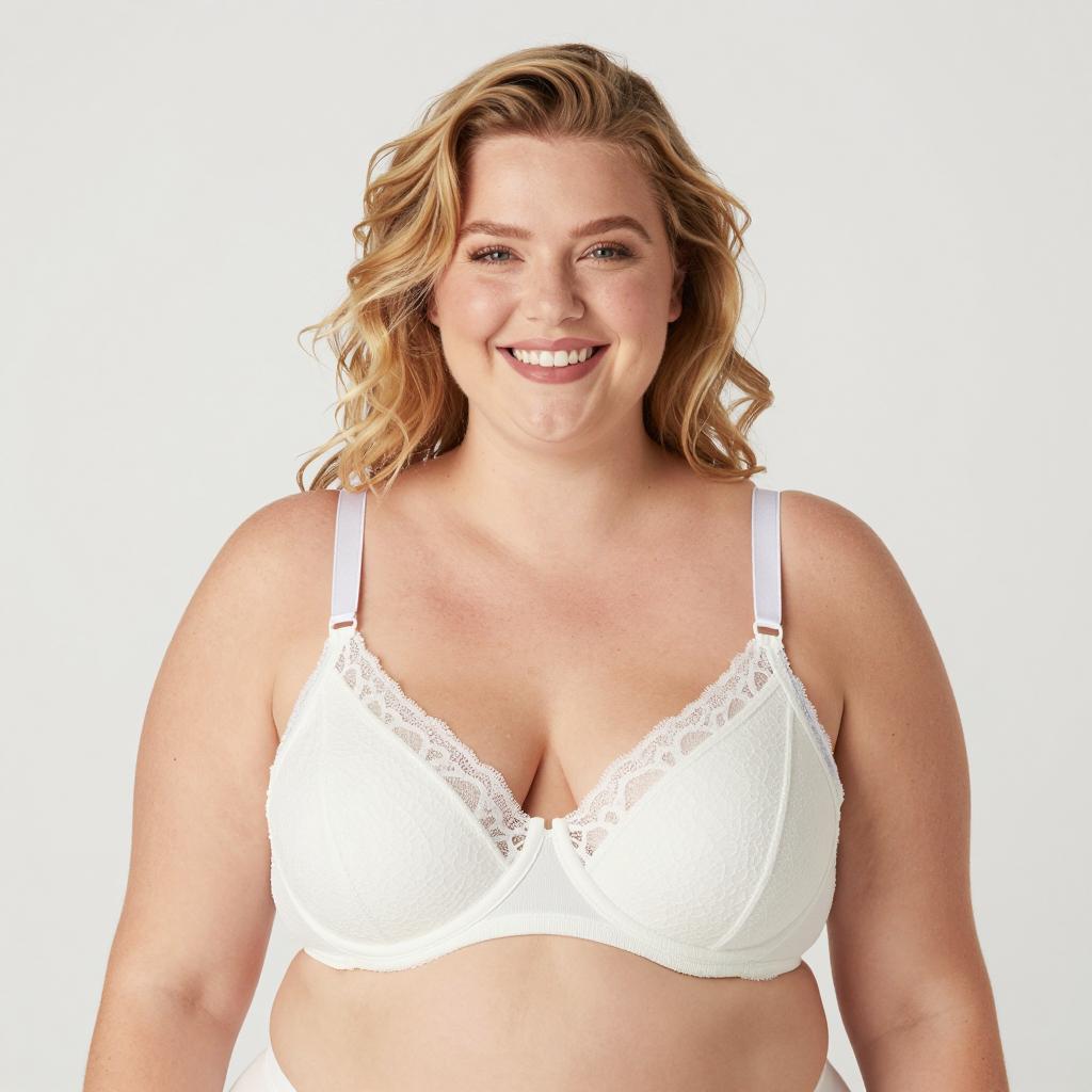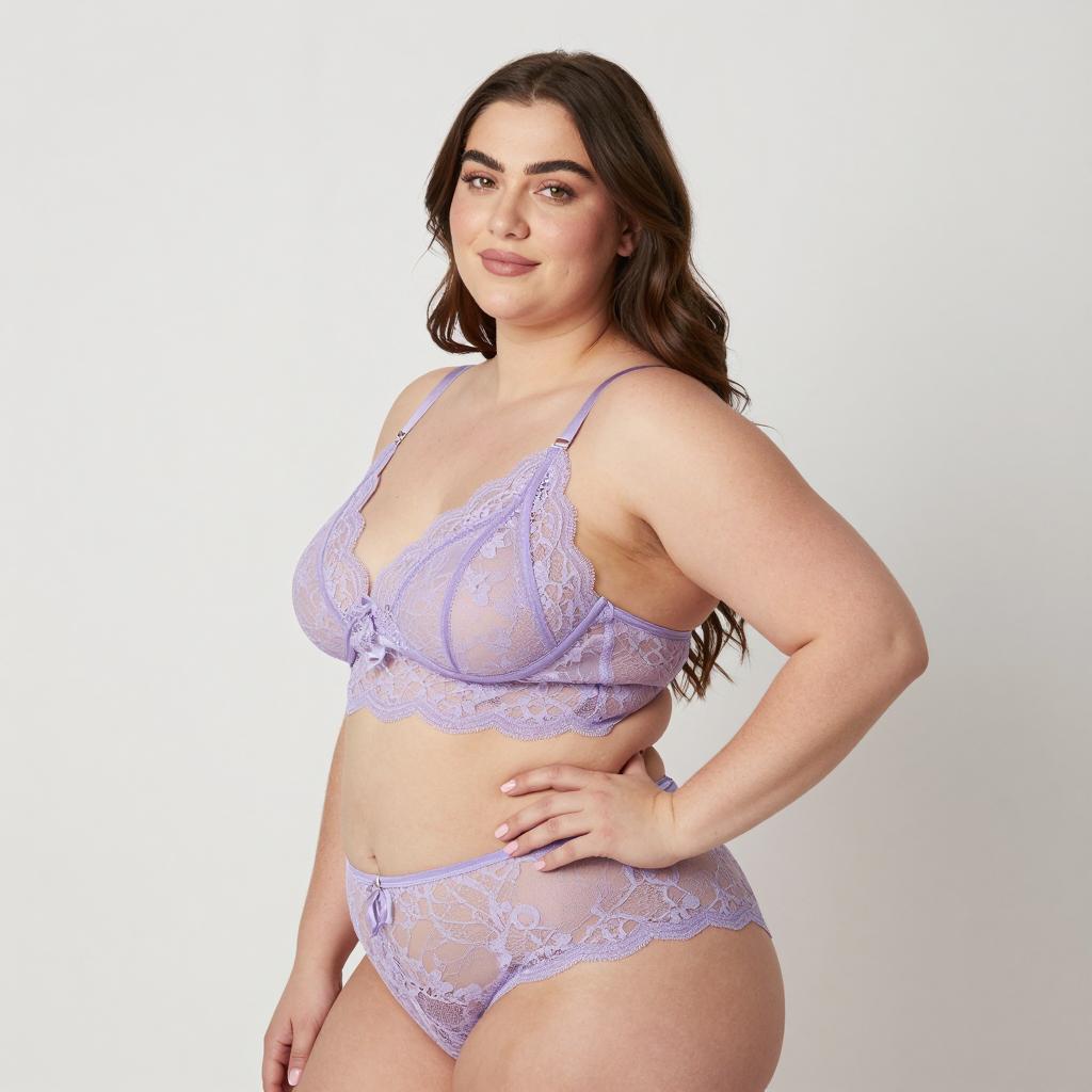 Plus-sized woman with light brown hair, wearing a lavender bra with white lace cups, standing against a colorful gradient background. Her facial expression is neutral. She has light skin, and the bra has a central clasp. She is facing forward with her arms at her sides. The background has vibrant blue, yellow, and pink gradients.