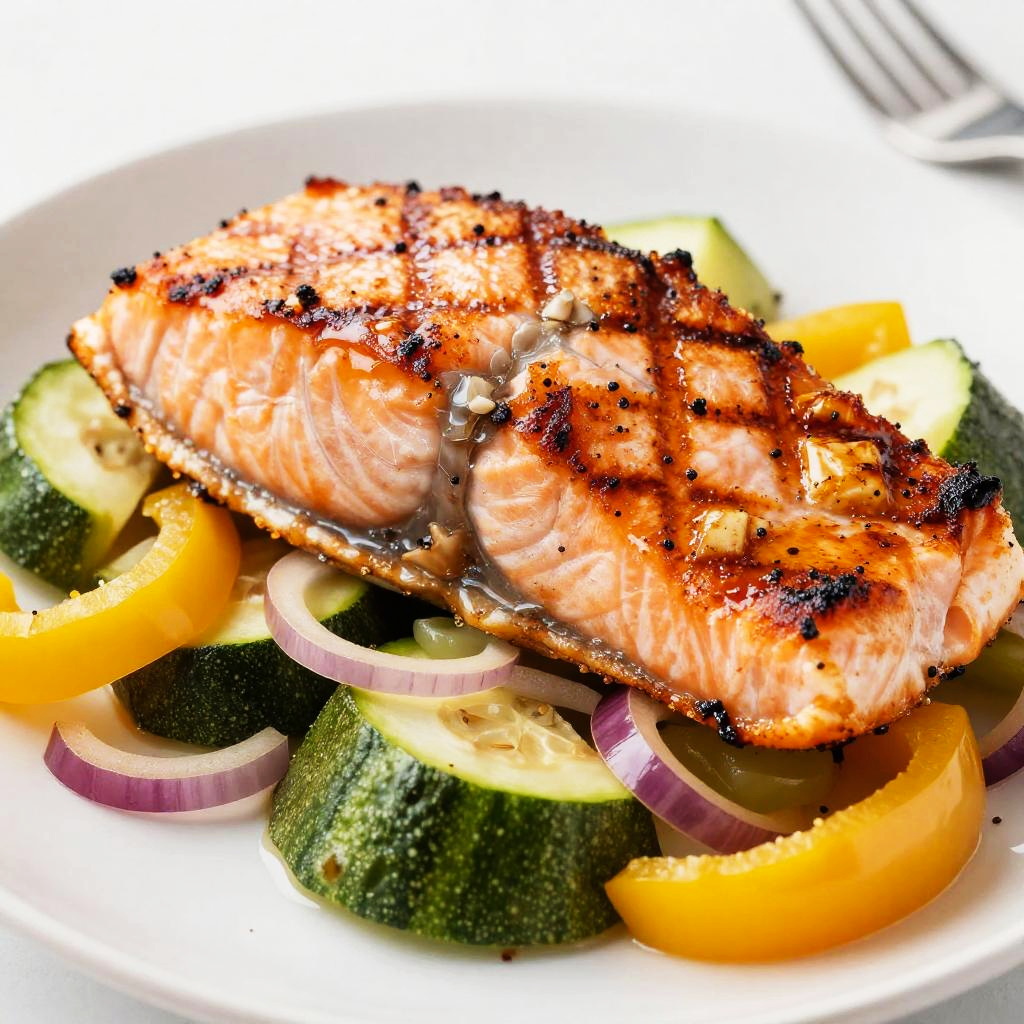 A close-up, vibrant photograph of a perfectly grilled salmon fillet, glistening with a crispy, caramelized brown crust. The fish is stacked on top of a colorful, chunky vegetable medley featuring green zucchini, yellow bell peppers, and red onions. The background is a bright white, making the rich orange and brown hues of the salmon stand out. The textures are juicy and succulent.