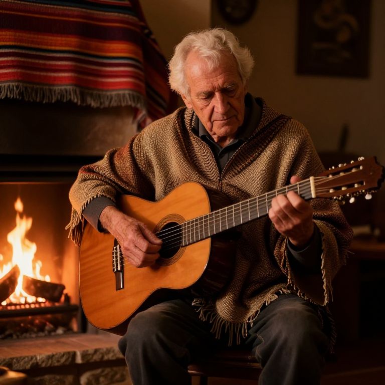 Abuelo playing an old acoustic guitar beside a crackling fireplace, wearing a woven poncho, colorful woven blankets in the background, rich textures, warm ambient light, intimate and heartfelt scene, photorealistic rendering.