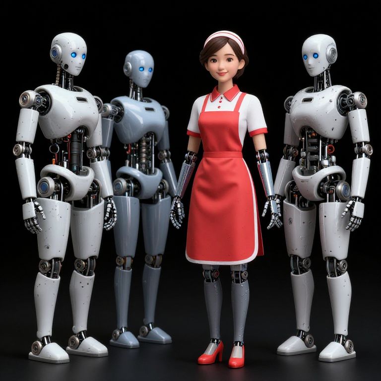 Wash full length, full charater, (vietnamese waitress cyborg robots) created from tiny abandoned industrial parts, realistic, black background,