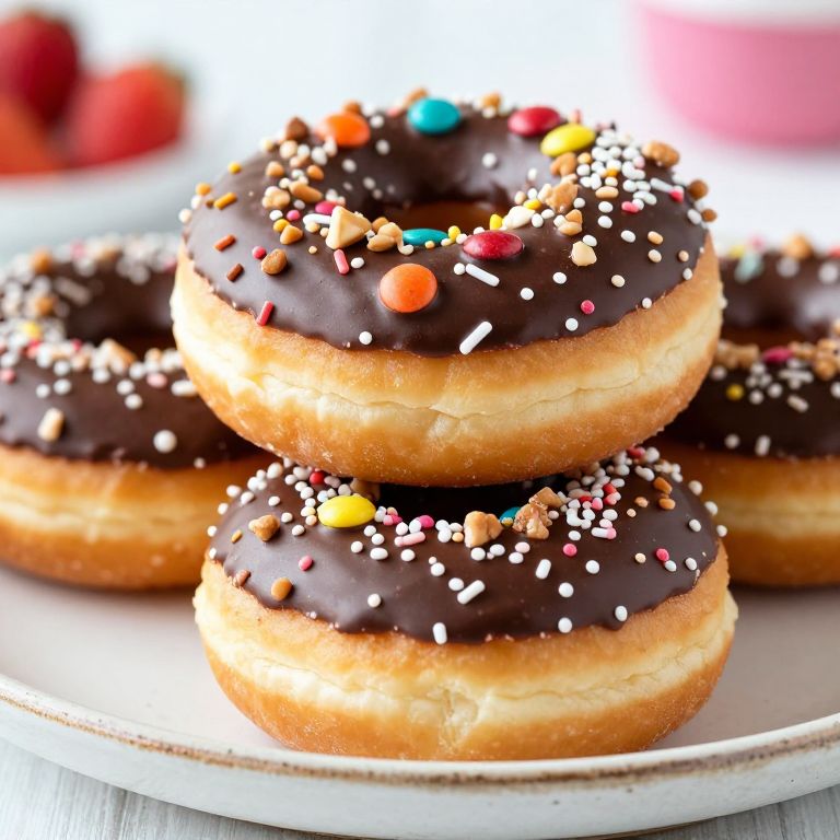 Close-up of doughnuts stacked with glossy chocolate and strawberry frosting, sprinkled with nuts and colorful candy pieces, on a vintage ceramic plate, bright and cheerful setting with bokeh background, high detail, appetizing and inviting