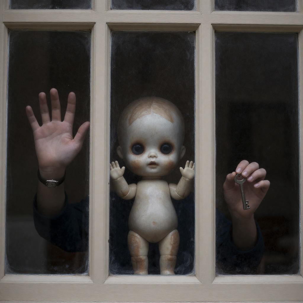 Photograph of a window with three panes. A small, eerie doll with wide, black eyes and a pale face is centered, pressing against the glass. To the left, a human hand with an outstretched palm and a wristwatch is visible. To the right, another human hand holds a key. The window frame is beige, and the glass is ured.