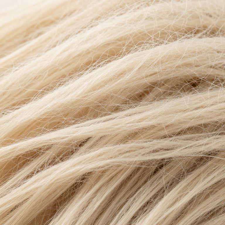 Wool hair texture close-up, detailed strands interwoven, soft natural fibers, warm creamy tones, realistic lighting, macro photography style, cozy and tactile feel