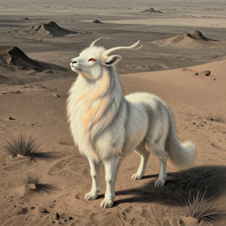 Digital artwork of a majestic white, furry, horned mythical creature with red eyes standing in a desert with sand dunes and sparse vegetation.