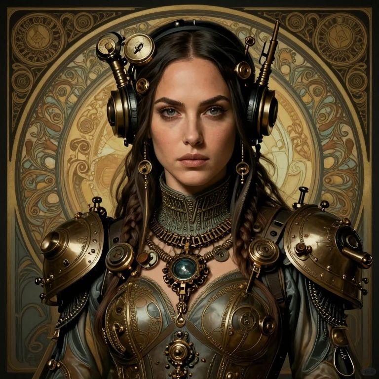 Digital artwork of a serious, pale-skinned woman with dark hair, wearing steampunk armor with gears and brass elements, set against an ornate