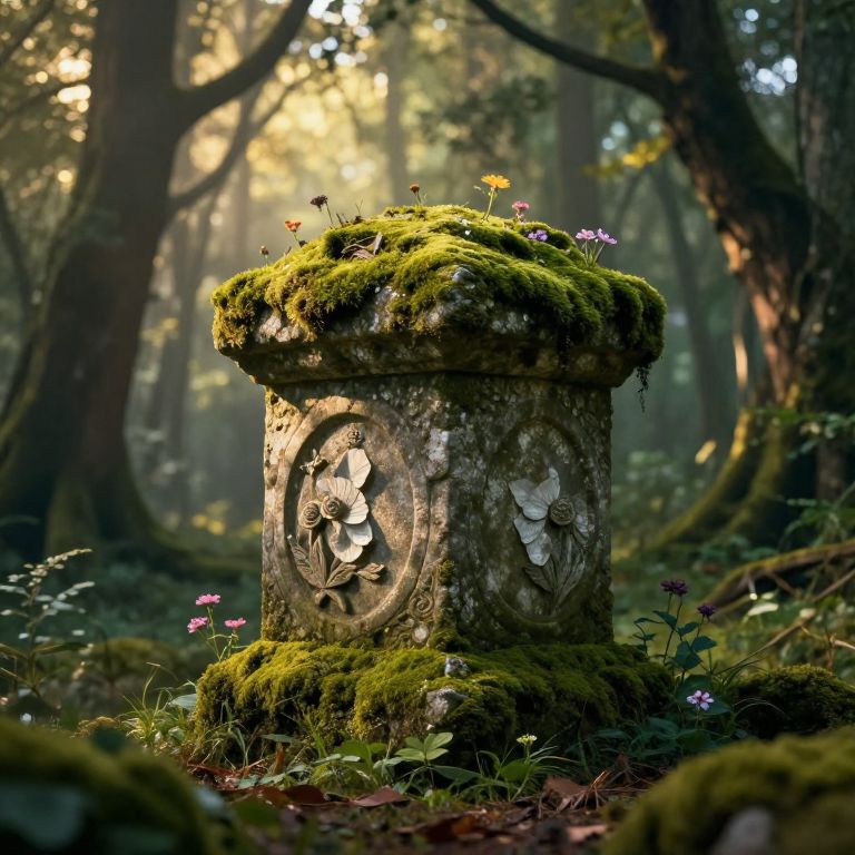 Photorealistic forest scene with a moss-covered, intricately carved stone tomb adorned with delicate flowers, surrounded by sunlight filtering through trees.