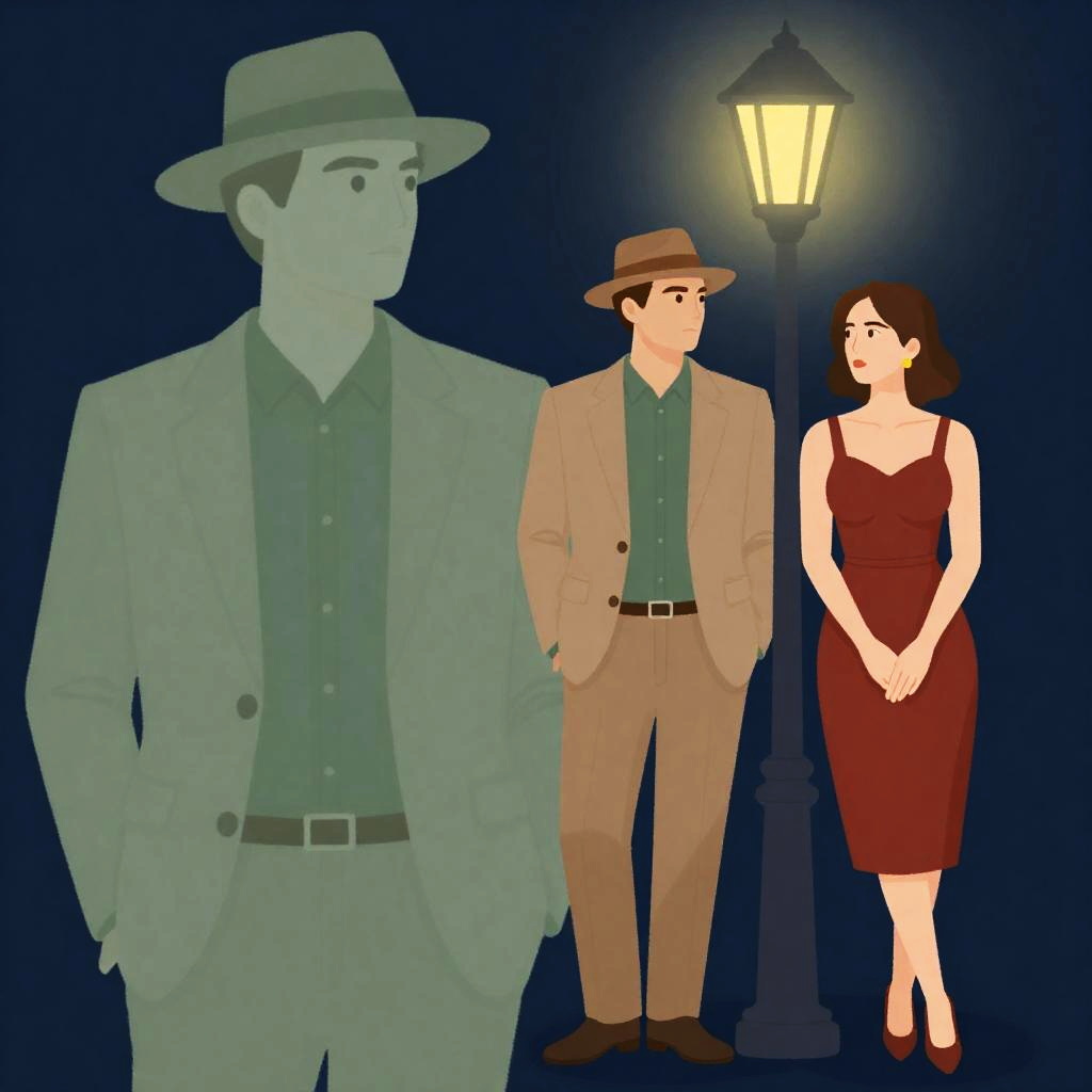 Illustration of three people. A man in a green suit and brown shoes walks with a cigarette in his mouth. A woman in a white dress and hat with a brown fur coat drapes over her shoulder. A topless blonde woman in pink pants and yellow boots leans forward. All are walking side by side. The man has a serious expression, the women have neutral expressions.