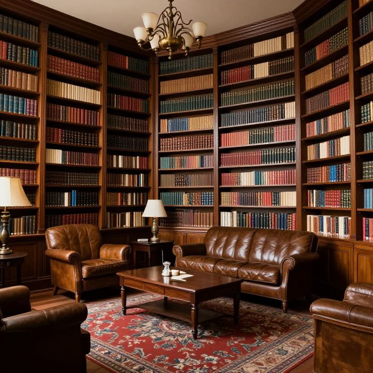 Photograph of a traditional library room with dark wooden bookshelves filled with colorful leather-bound books covering the walls. The room features two brown leather tufted sofas and an armchair, arranged around a wooden coffee table with a small glass of water and a book. Two table lamps with white shades sit on dark wooden side tables. A red, patterned rug covers the floor. A chandelier with five lights hangs from the white ceiling. The setting exudes a classic, scholarly atmosphere.
