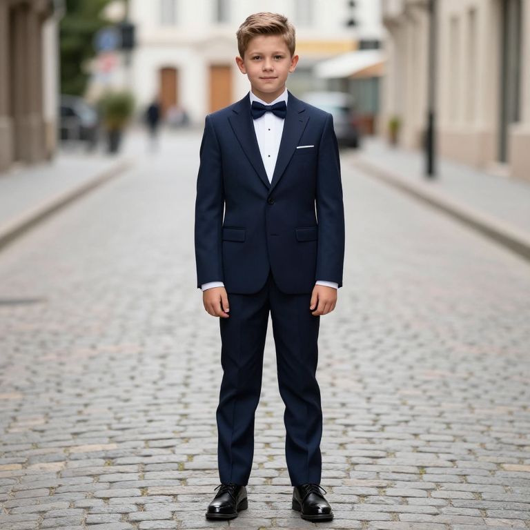 Fancy Gents Dress, boy in a suit and bow tie standing on a cobblestone street