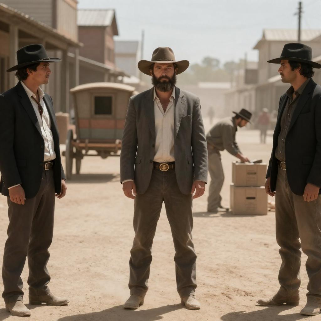 Photograph of a dusty Western town street. A bearded man in a grey suit and open shirt stands in the center, looking forward. Two men in black suits and wide-brimmed hats stand on either side. Background includes a wagon and two men bending over boxes. Sunlight creates shadows.