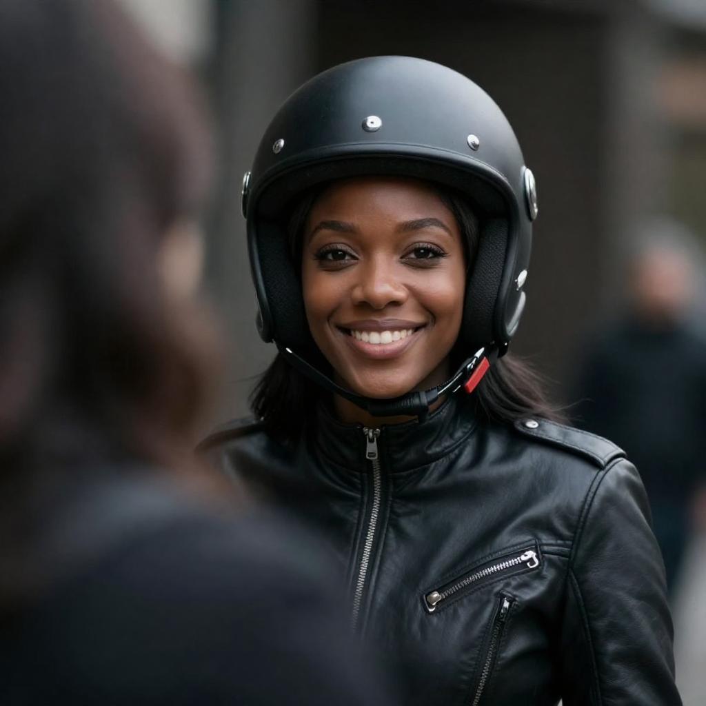 Photograph of a Black woman with medium-dark skin, wearing a black leather helmet and jacket with high collars, smiling. She has straight black hair peeking from under the helmet. The background is dark and blurry. Another person with brown hair is partially visible in the foreground, facing the woman.