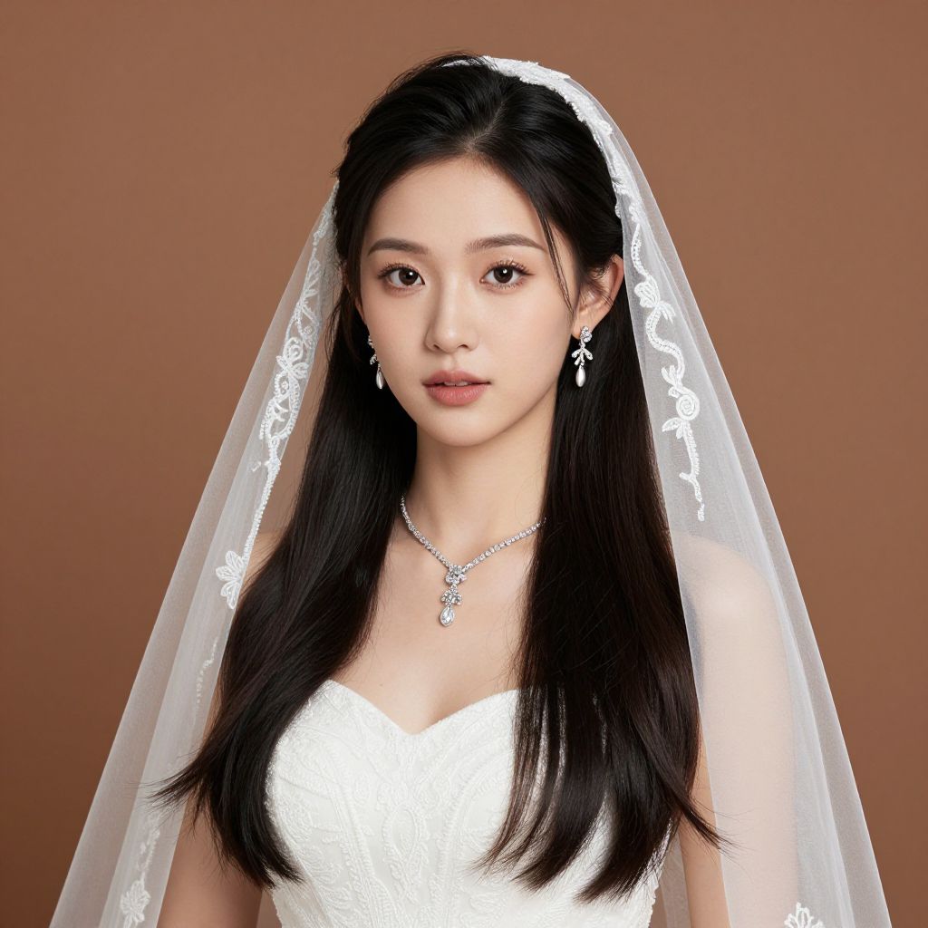 Bridal hairstyle long hair, 1girl, solo, jewelry, veil, necklace, earrings, long hair, black hair, dress, looking at viewer, brown background, realistic, makeup, bridal veil, wedding dress