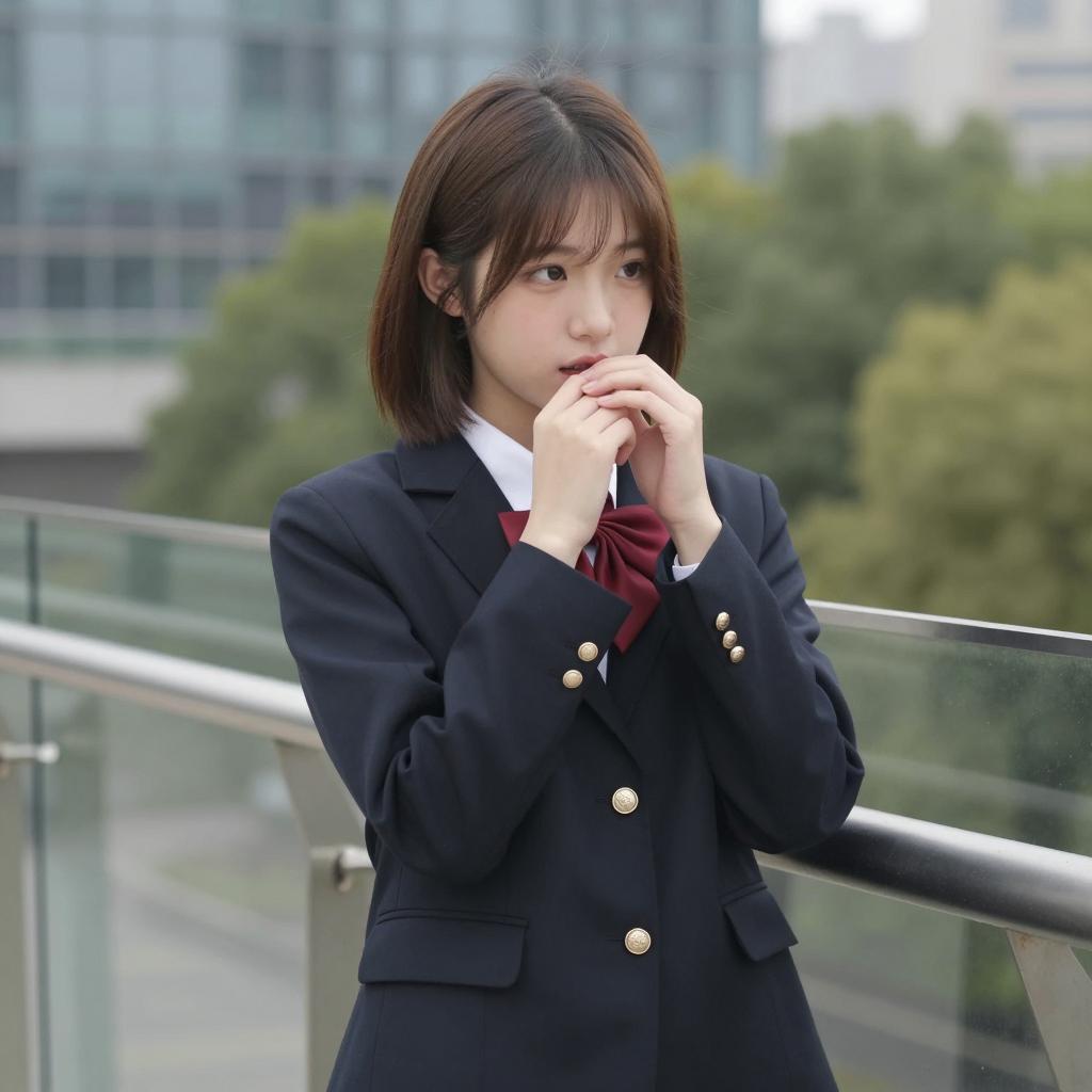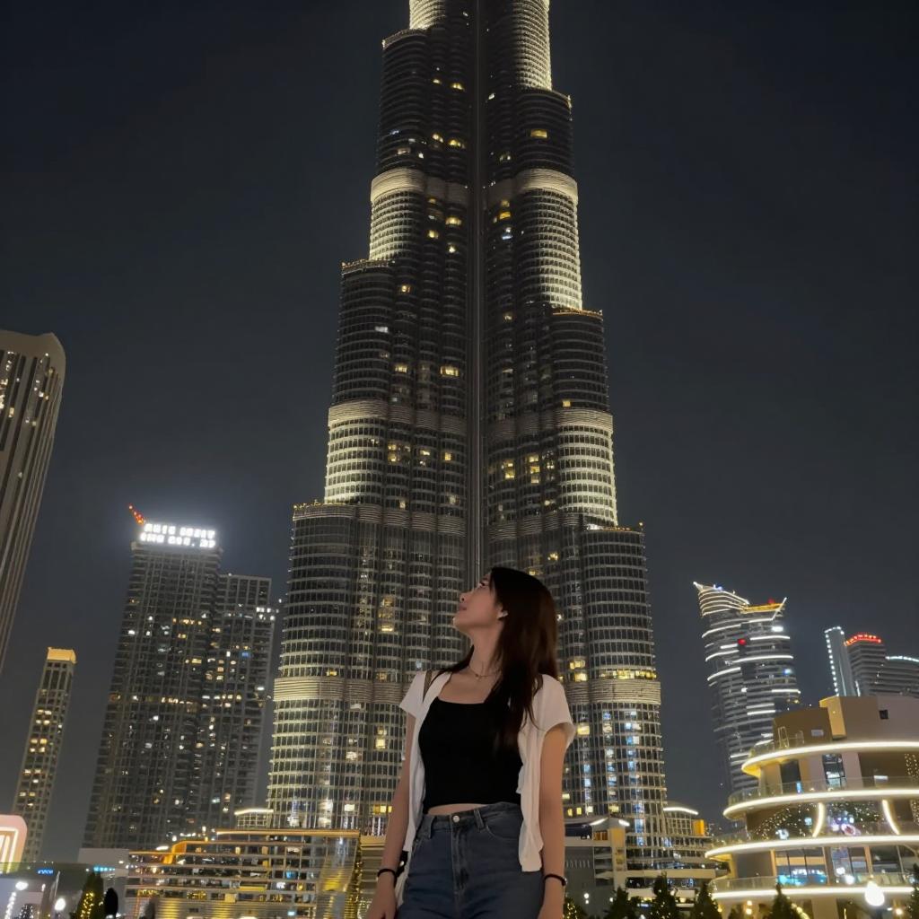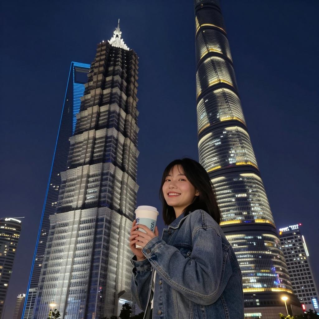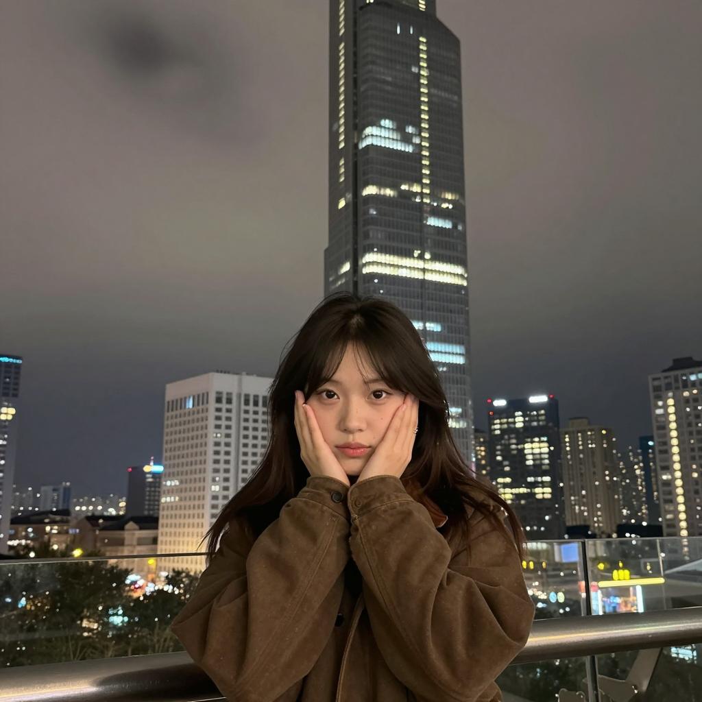 A young woman with long dark hair wearing a cozy brown jacket, posing with her chin resting on her hands in front of a towering modern skyscraper illuminated at night, cloudy sky in the background, urban cityscape with glowing building lights, cinematic moody atmosphere