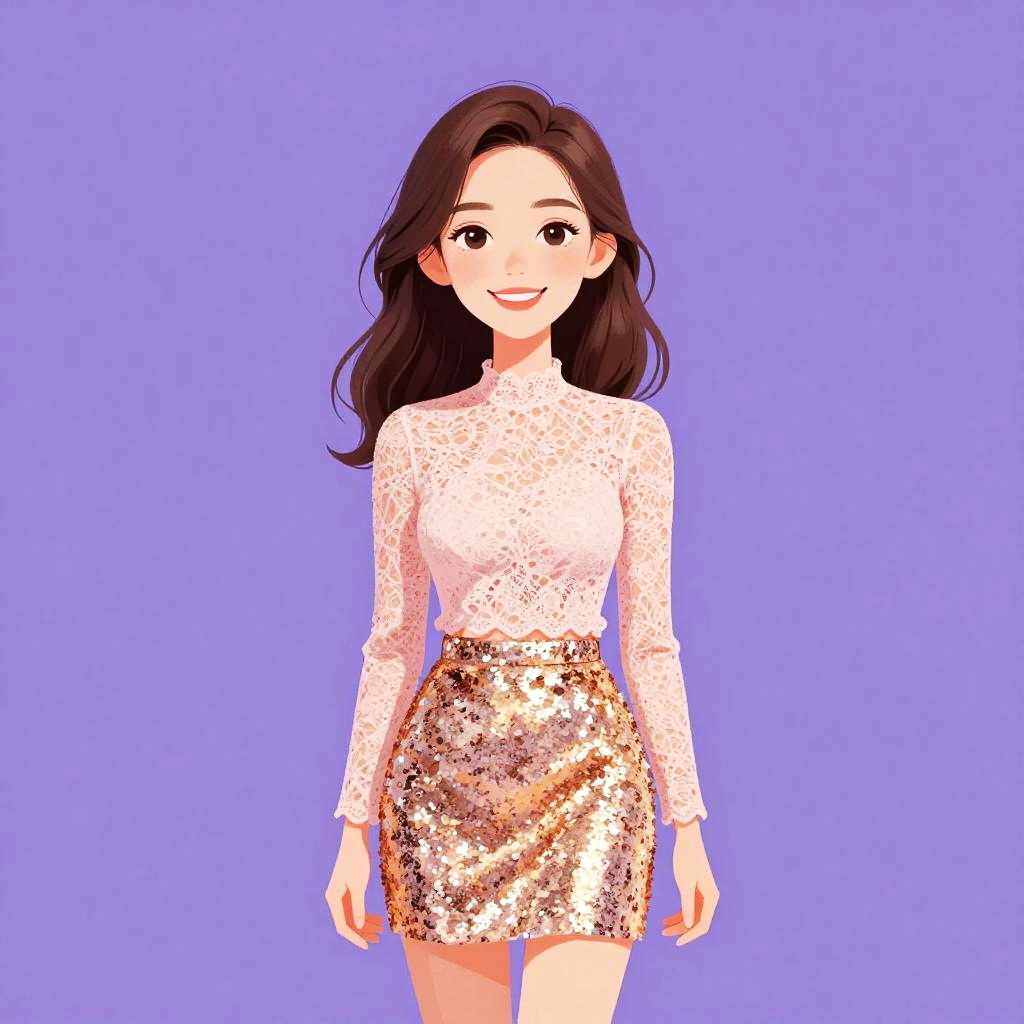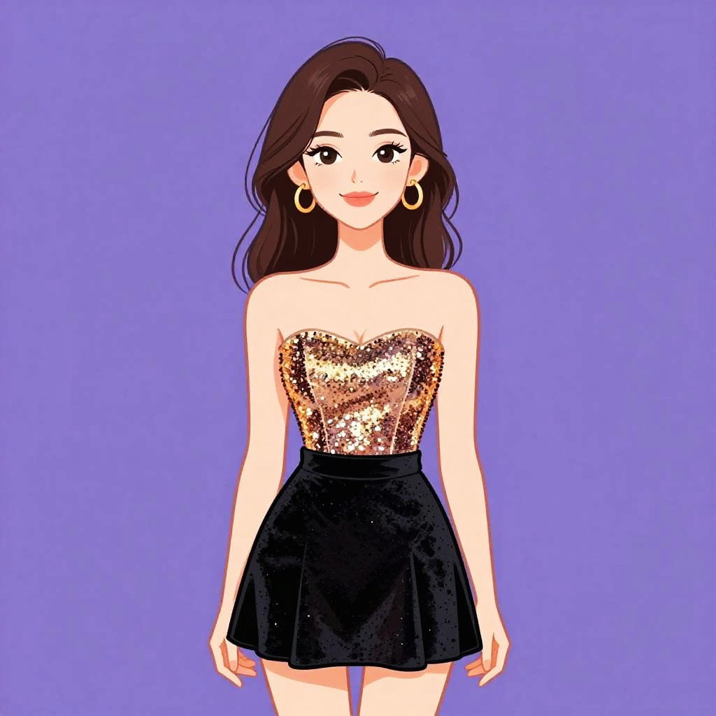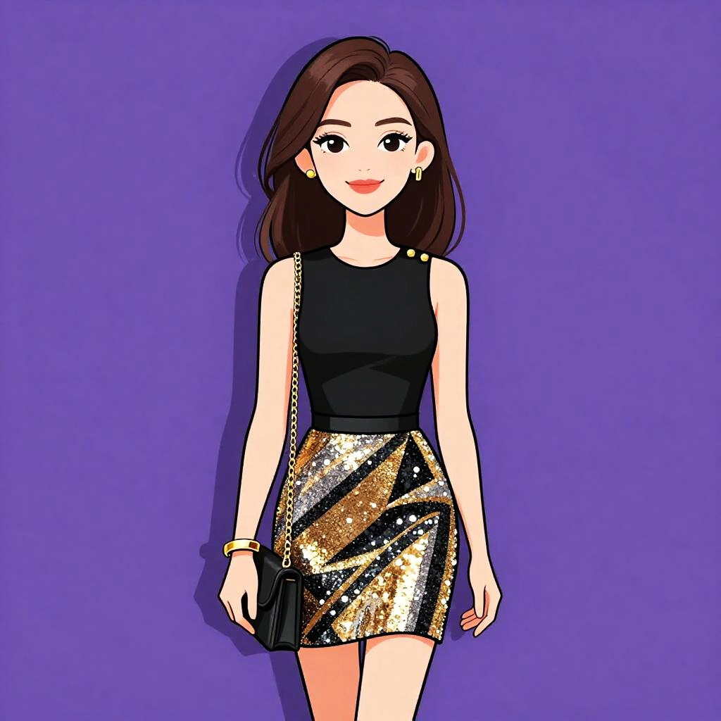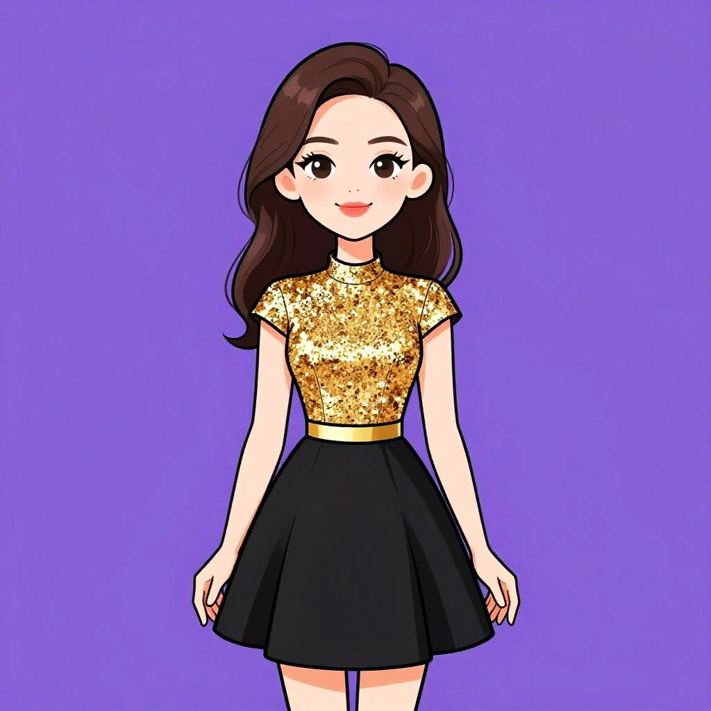 Woman with pretty face and pretty hair. smiling Woman, chic, black and gold short dress, high neckline, cap sleeves, fitted gold sequin bodice, contrasting plain black A-line skirt, thin gold belt at waist, mid-thigh length. --sref 1467