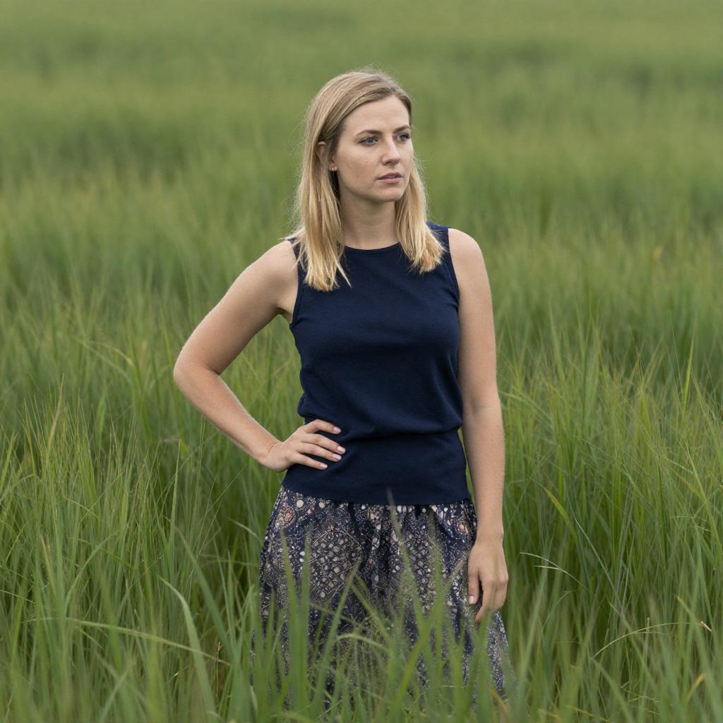 Photograph of a woman standing in tall, green grass. She has shoulder-length blonde hair, wearing a navy blue sleeveless top and a patterned skirt. Her right hand rests on her hip, and she looks slightly to the right with a neutral expression. The grass is dense, covering most of her lower body and extending upward in the background.
